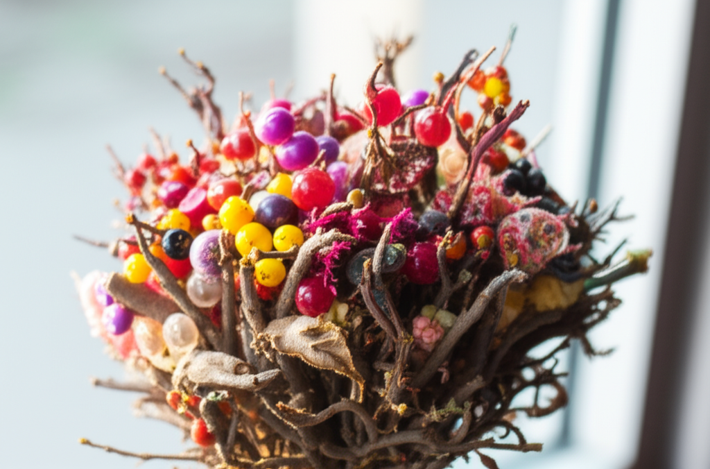 Untuk pasangan yang berani tampil beda, buket pengantin tidak harus selalu bunga segar. Bayangkan buket yang dirangkai dari bros antik, kancing vintage, pita satin berbagai tekstur, ornamen kecil yang memiliki makna bagi pasangan, atau bahkan bunga-bunga yang terbuat dari kain brokat atau kertas daur ulang. Buket semacam ini tidak akan layu dan bisa menjadi kenang-kenangan yang diwariskan. Untuk buket lemparan, bisa juga diisi dengan permen lolipop atau miniatur botol sampanye kecil.
