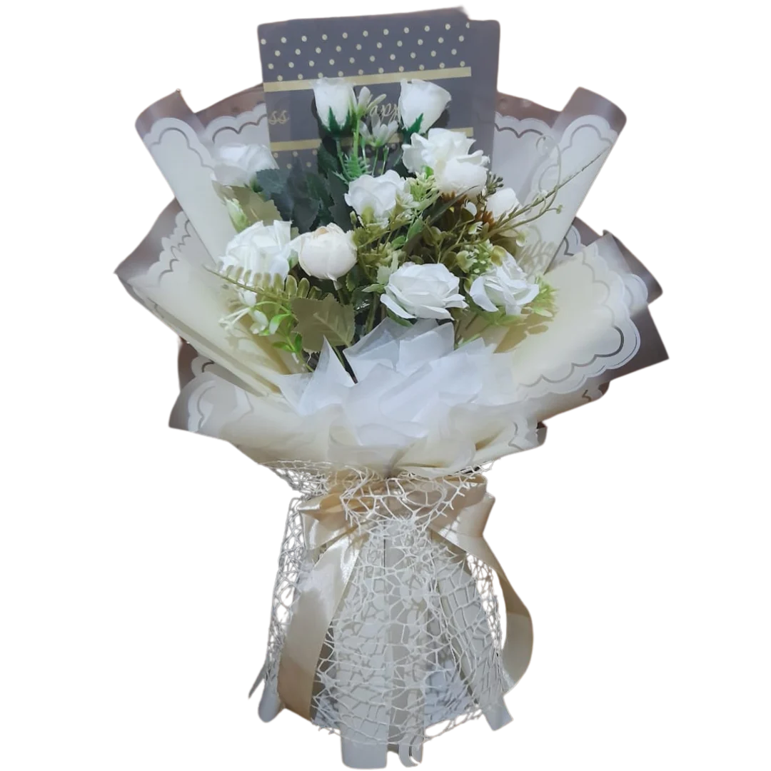 Kemasan buket yang menarik dapat meningkatkan nilai estetis hadiah Anda. Gunakan kertas pembungkus bertekstur elegan dan tambahkan pita atau kartu ucapan untuk memberikan sentuhan akhir yang spesial.
